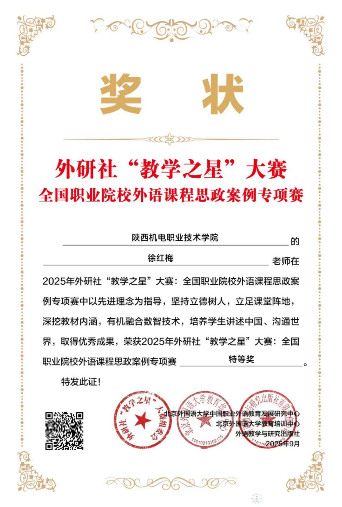 近日,2025年外研社“教学之星”大赛全国职业院校外语课程思政案例专项赛圆满落幕。BEAT365官网基础部英语教研室徐红梅老师凭借扎实的教学功底和独具创新的思政案例设计,在高职英语组赛道脱颖而出,荣获全国特等奖,为学校赢得殊荣。