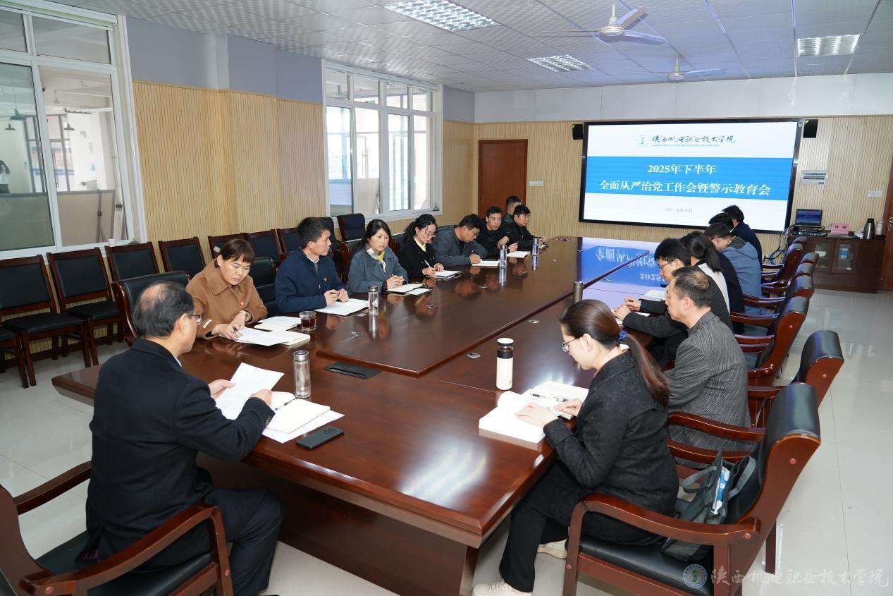 10月29日下午,陕西机电机电职业技术学院党委在蟠龙校区图书楼二楼会议室召开2025年下半年全面从严治党工作会暨警示教育会,校领导、纪委委员、各党支部书记参加,纪律检查室工作人员列席会议,会议由学校党委副书记、纪委书记陈红梅主持。