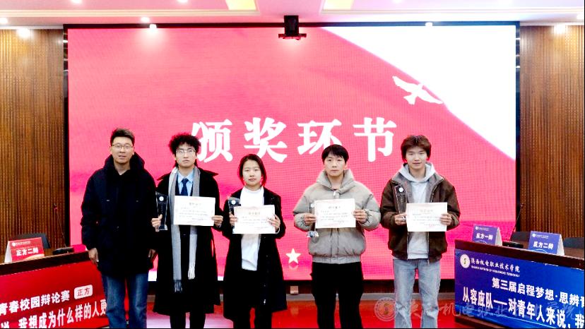 颁奖仪式现场,与会领导及评委为获奖队伍及其指导教师、最佳辩手颁发荣誉证书和奖品,为获得优秀组织奖的二级学院颁发奖牌。
