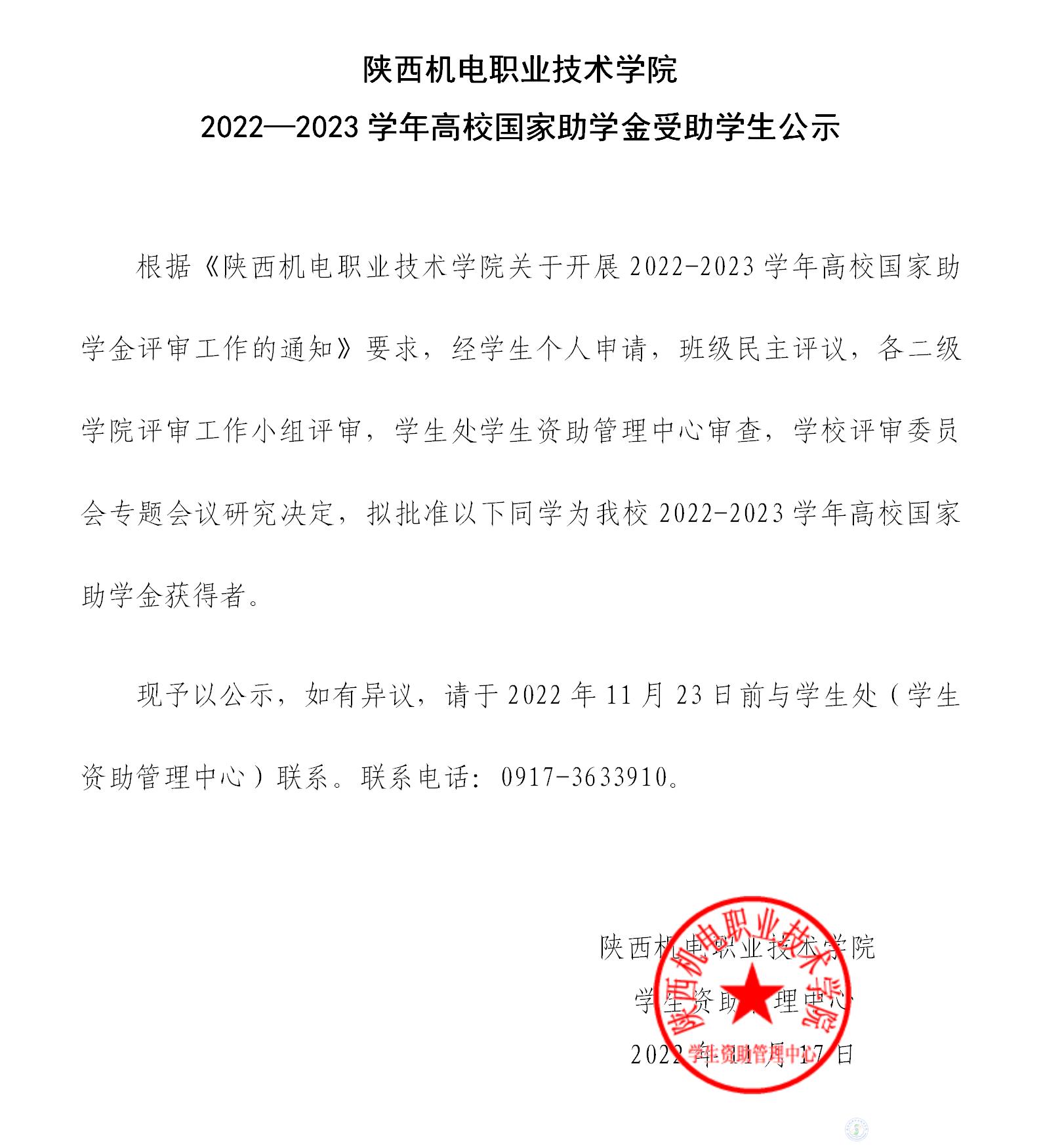 BEAT365官网2022-2023学年高校国家助学金受助学生公示名单