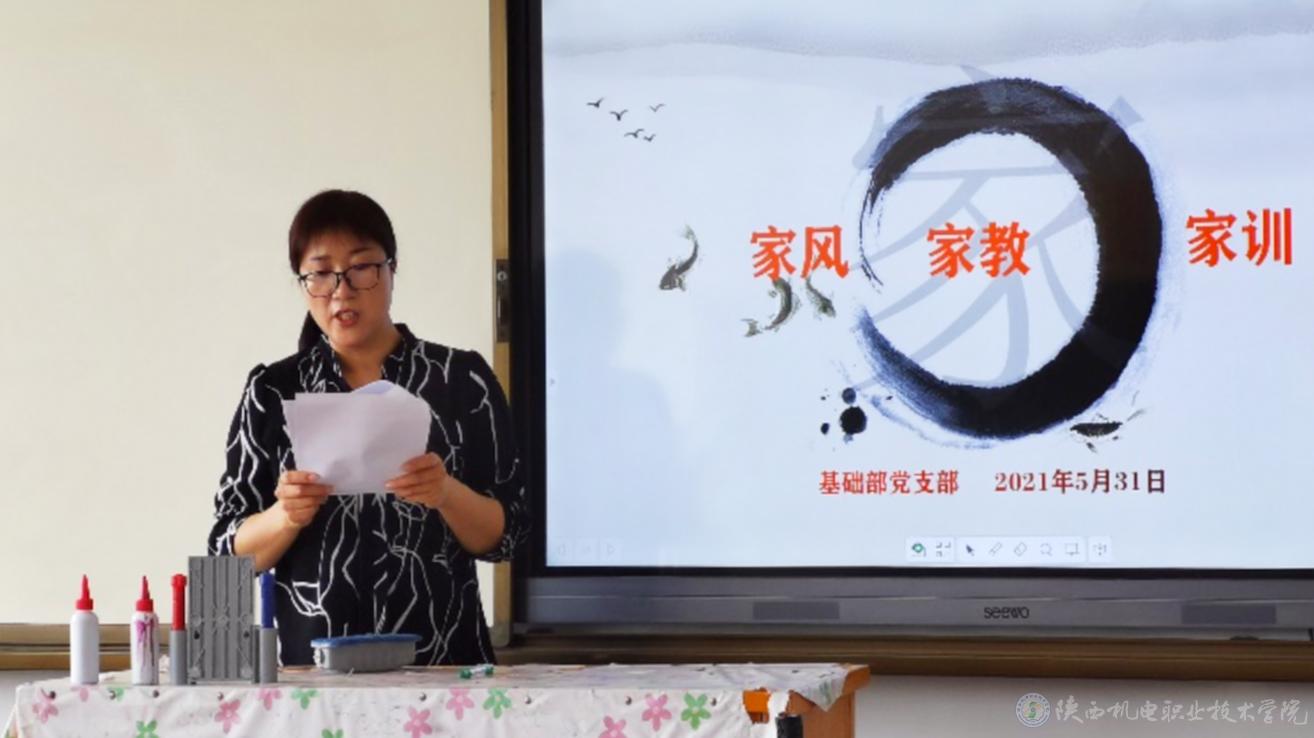 为深入学习贯彻习近平总书记关于注重家庭家教家风建设重要论述,落实十九届中央纪委五次全会和十三届省纪委五次全会关于严格家教家风,引导党员干部修身正德、律己守廉的重要部署,以良好家风助推全面从严治党向纵深发展,基础部党支部结合党史学习教育精神认真开展“德润三秦”家风建设活动。