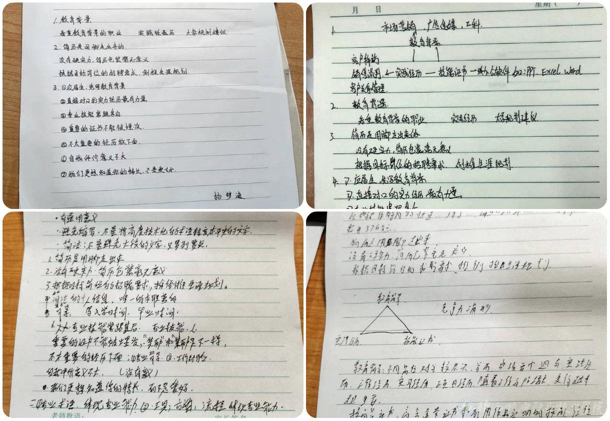此次讲座招生就业处精心准备安排布置,做好了讲座前宣传及服务的各项工作;各二级学院积极组织,做到了人人知晓,人人参与;参与师生均能认真参加讲座,撰写学习笔记。此次讲座,紧贴学生的就业实际,意在培养学生正确的就业观、择业观和职业生涯规划意识,教会学生如何通过制作简历更好地展现自己、提升自己的职场竞争力,对提升学校毕业生的求职技能和职业素养起到了积极的推动作用。