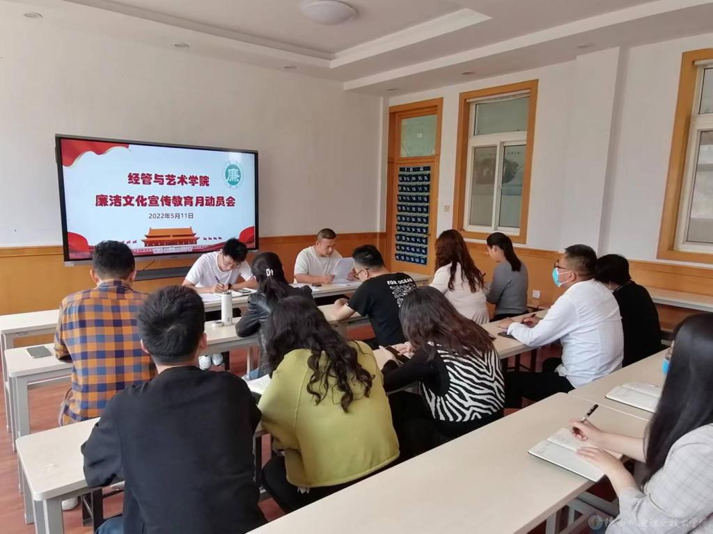 2022年5月11日,经管与艺术学院全体教师在经管建筑二楼会议室参加廉洁文化宣传教育月动员学习会。