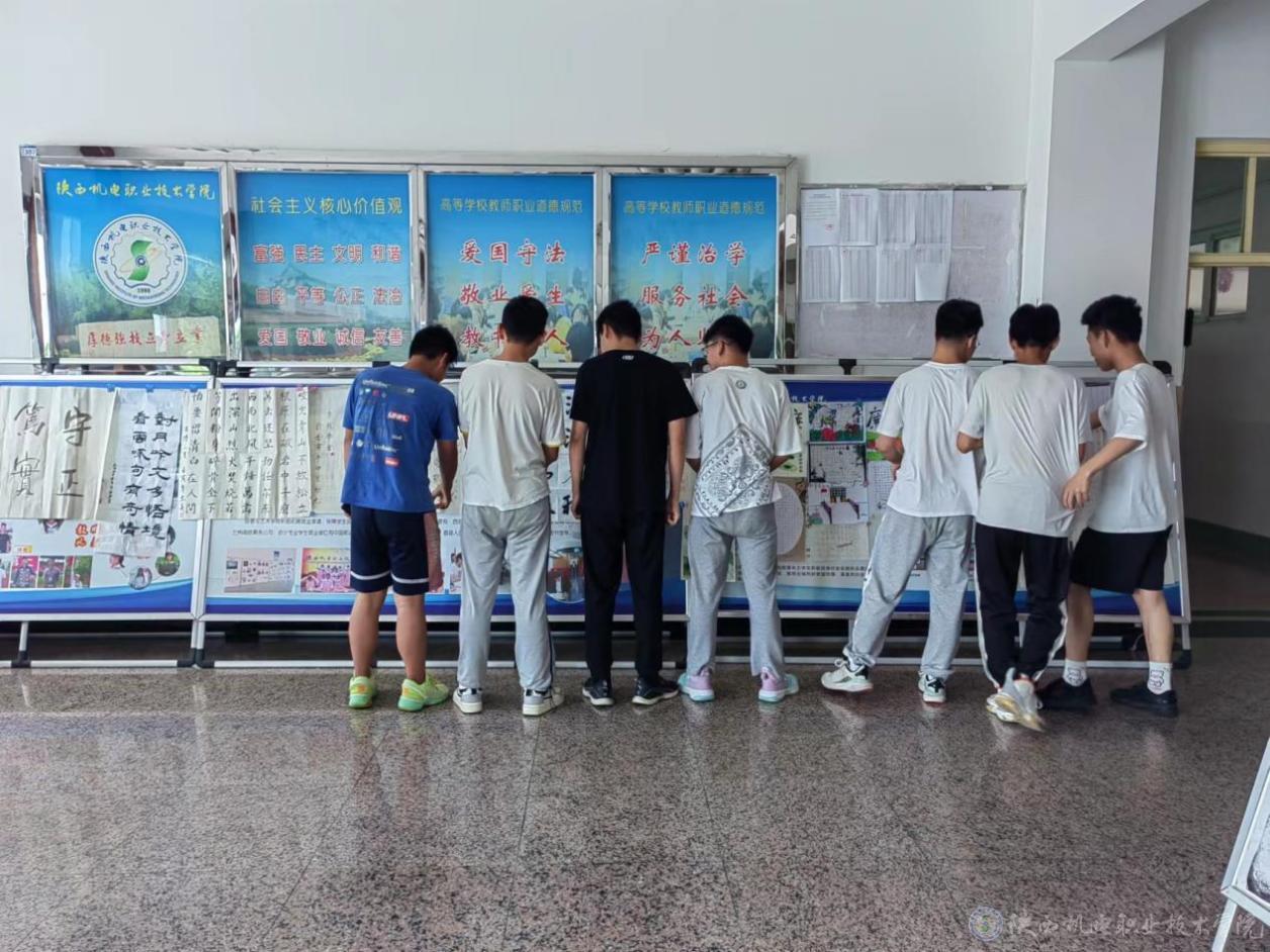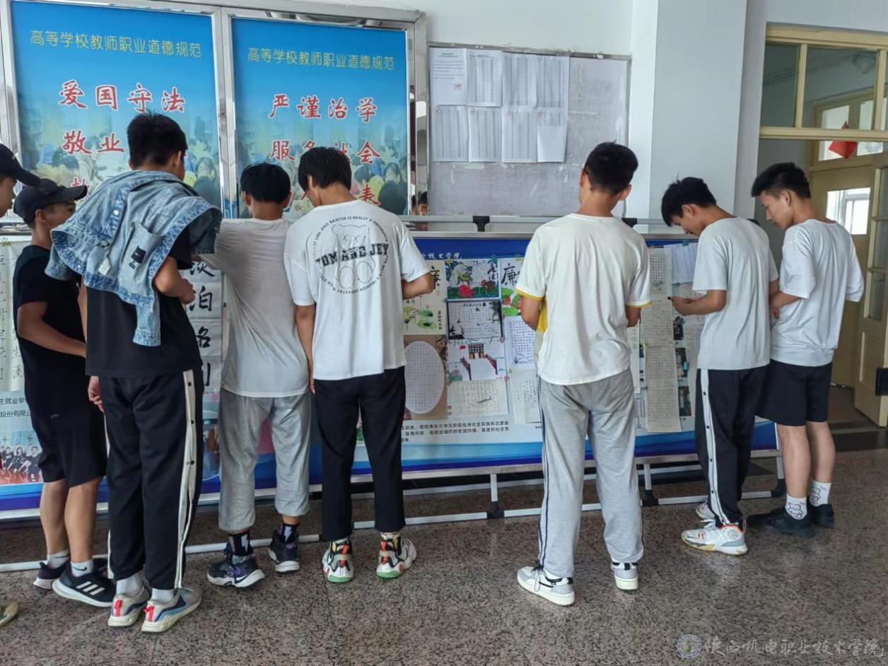 作品吸引了同学们的驻足观赏,他们有的默默浏览,有的出声诵读,有的谈论品评,浸润在廉洁清风之中。