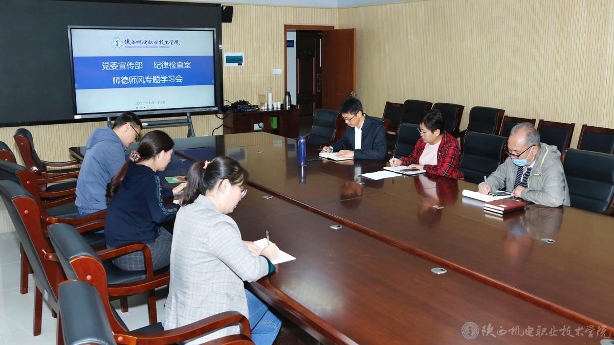 为进一步推进师德专题教育,扎实开展师德师风建设问题专项整治工作。2022年9月23日,党委宣传部及纪律检查室两部门在蟠龙校区图书馆二楼会议室联合召开了师德师风突出问题专项整治工作会,会议由党委委员党委宣传部部长李明主持。两部门所有成员参见了此次会议。